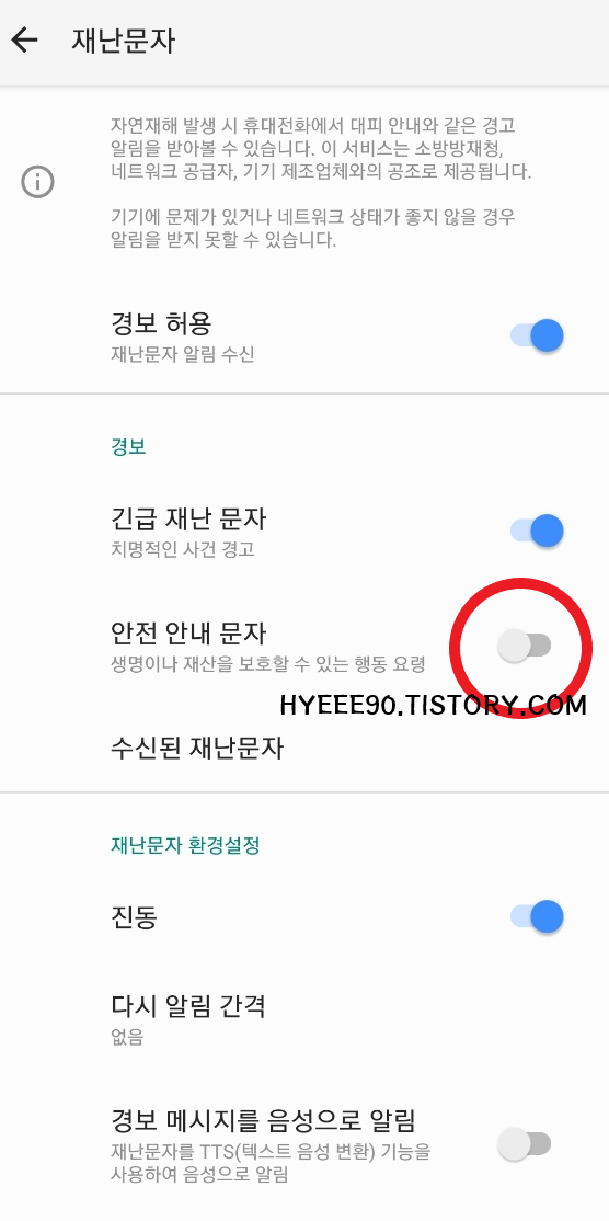 안전 안내 문자 비활성화 시켜두면 안 받을 수 있다.